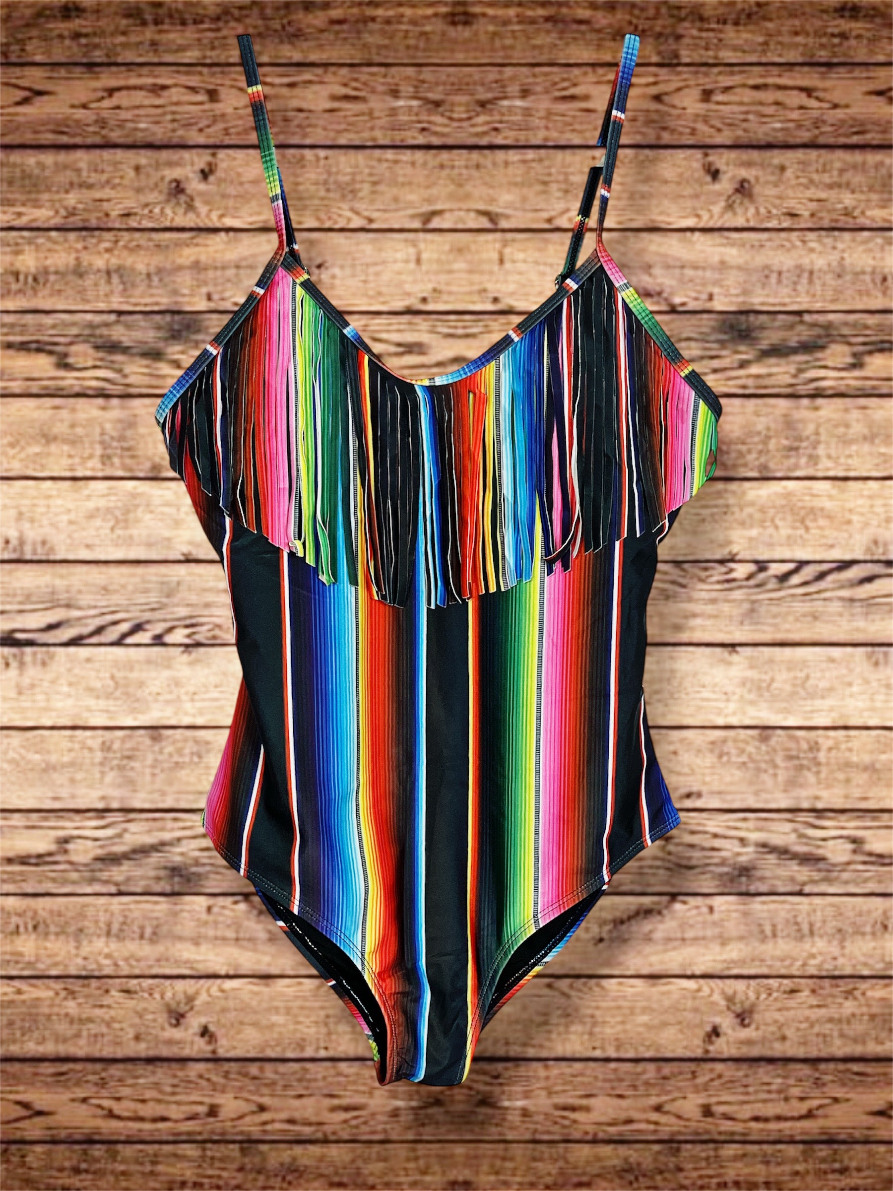 "Get ready to ride the waves in style with our Serape Fringe Swimsuit! This unique swimsuit features a playful serape design and flirty fringe, perfect for standing out at the beach. With a touch of cowboy charm, our swimsuit is not only flattering but perfect for summer fun. Yeehaw!"